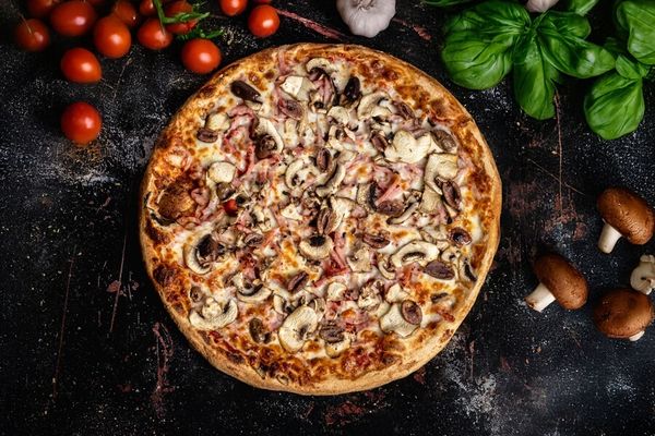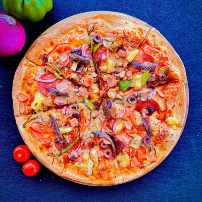 Pizza Sauce, Mozzarella, Chicken, Capsicum, Onion, Tomato, Mushroom, Olives, Pineapple, Ham, Pepperoni & Bacon