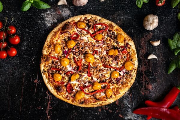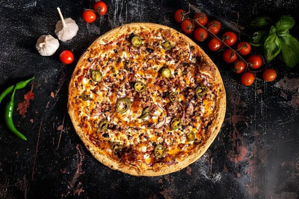 Pizza Sauce, Mozzarella, Onion, Beef, Jalapeños & Chilli Flakes Topped with Sweet Chilli Sauce