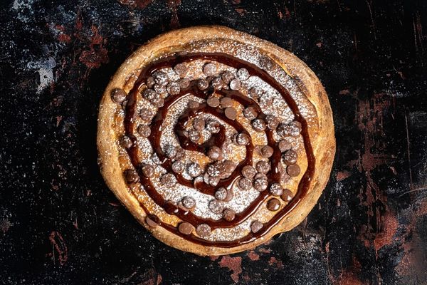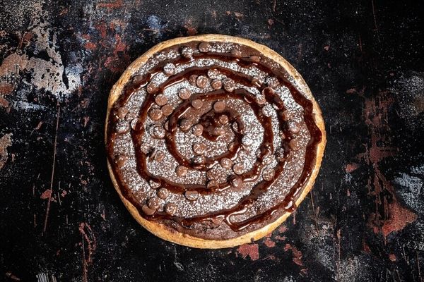 Vanilla dessert base mixed with choc chips, topped with chocolate sauce and icing sugar