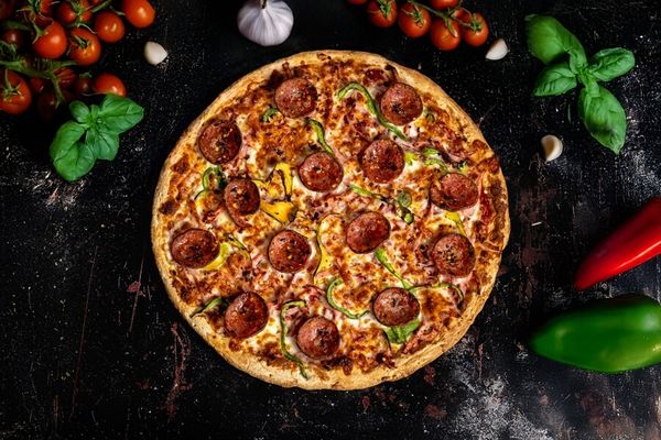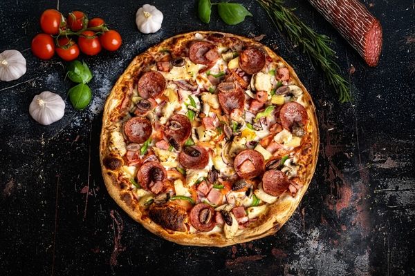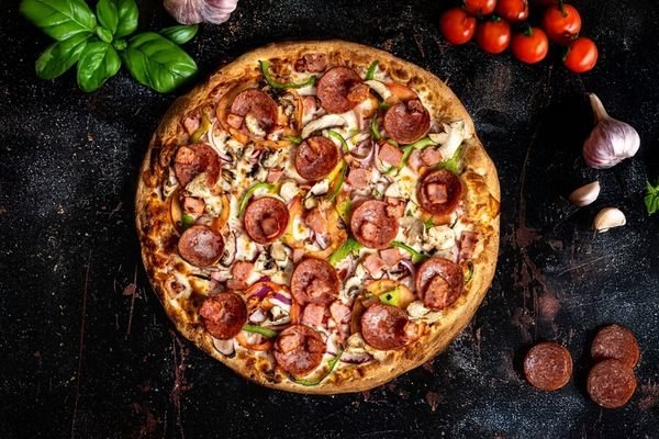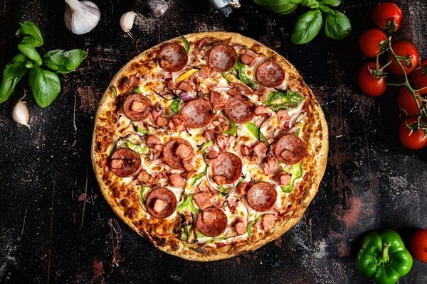 Pizza Sauce, Mozzarella, Ham, Pepperoni, Bacon, Onion, Tomato, Mushrooms & Capsicum