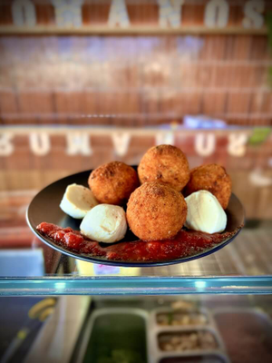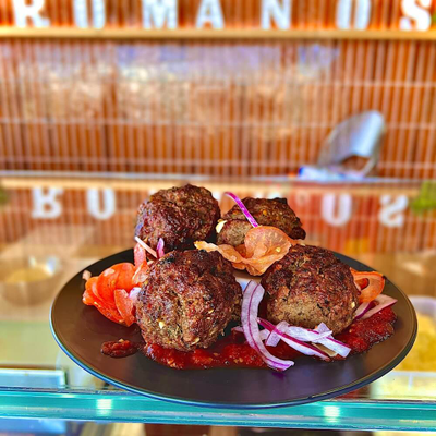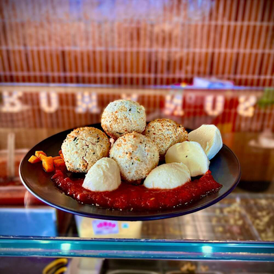 Italian Meatballs with a Napoletana sauce topped with onion and tomato. (Please note that this no longer comes with a small Cheesy Garlic Pizza)
