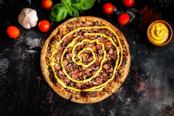 BBQ base, Mozzarella, Onion, Tomato, Beef, Bacon, topped with Mustard
