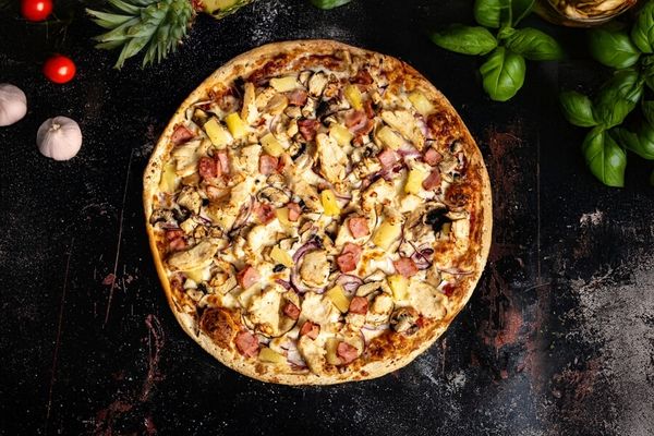 Pizza Sauce, Bacon, Chicken, Mushroom, Onion, Pineapple & Cheese