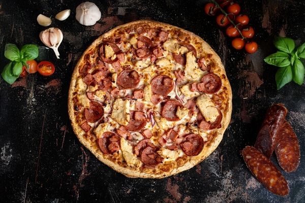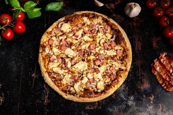 Pizza Sauce, Mozzarella, Ham, Pepperoni, Chicken, Onion & Bacon