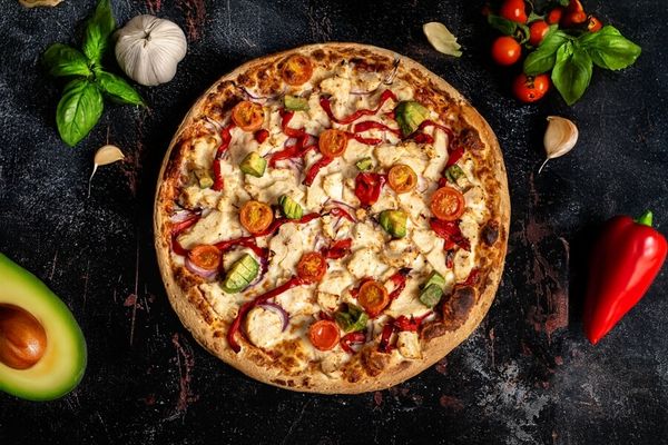 Pizza sauce base with Mozzarella, Onion, Chicken, Avocado, Cherry Tomatoes and Red Capsicum topped with Coriander