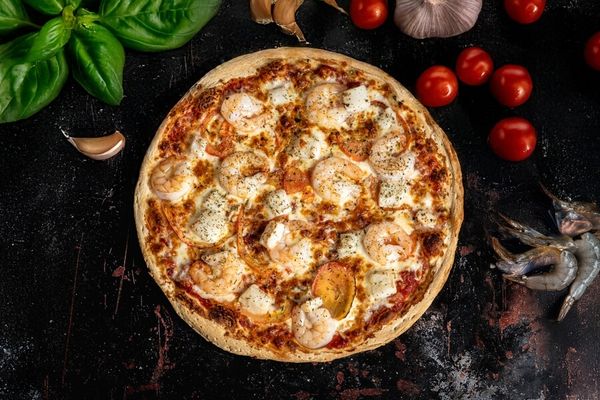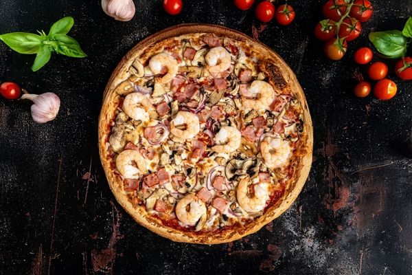 Pizza Sauce, Mozzarella, Prawn, Mushrooms, Onion & Bacon