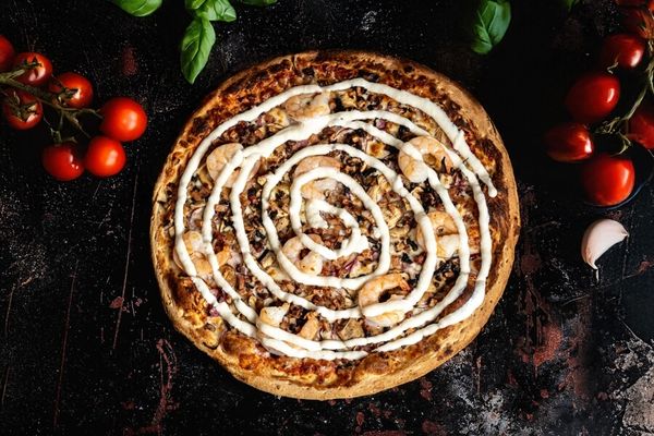 Pizza Sauce, Mozzarella, Prawn, Beef, Onion, Mushroom & Garlic Sauce