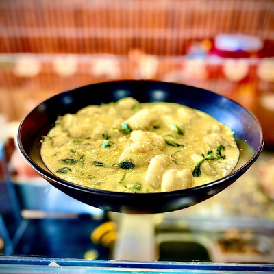 Potato gnocchi in creamy white wine & gorgonzola sauce with baby spinach