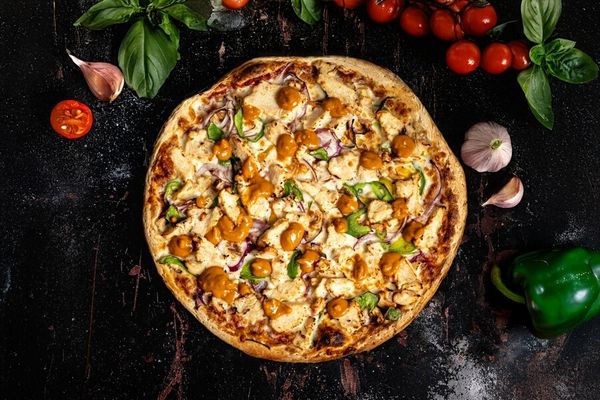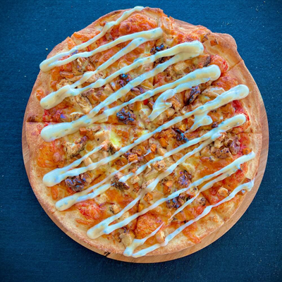 Chicken, Pizza Sauce, Mozzarella, Chicken, Onion, Capsicum & Cashews topped with Satay Sauce