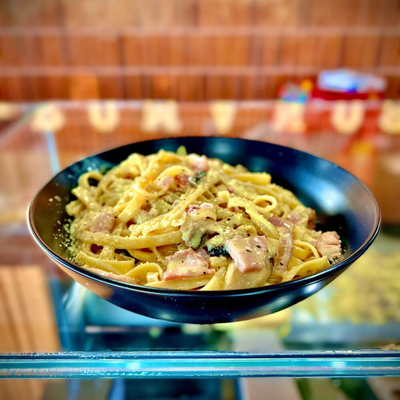 Fettuccine pasta with bacon, mushroom & onion with cracked pepper in a creamy white wine sauce