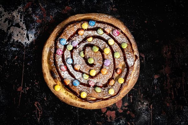 Vanilla dessert base mixed with smarties, topped with chocolate sauce and icing sugar