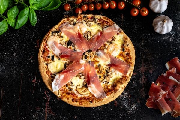 Pizza Sauce, Mozzarella, Prawn, Bocconcini, Mushroom, Fresh Prosciutto