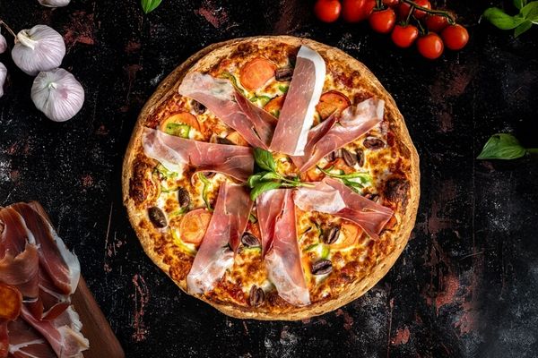 Pizza Sauce, Mozzarella, Fresh Prosciutto, Olives, Capsicum, Fresh Tomato & Basil