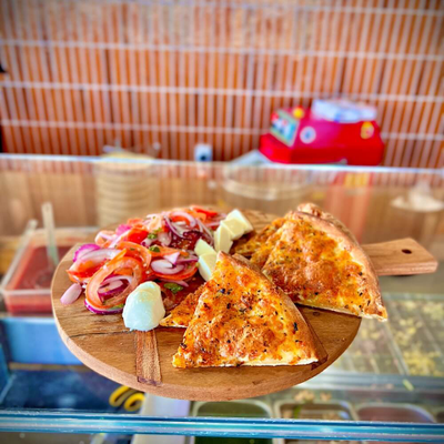 Pizza Sauce, Mozzarella, Minced Beef, Onion, Roast Capsicum, Sweet Potato & Garlic Sauce