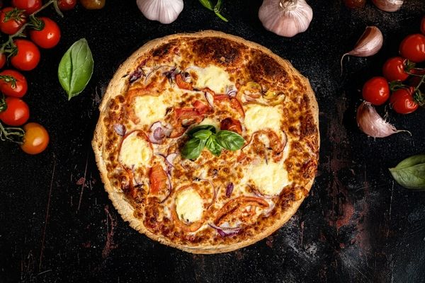 Pizza Sauce, Mozzarella, Fresh Tomato, Onion, Bocconcini & Fresh Basil