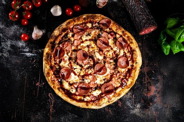 Pizza Sauce, Mozzarella, Bacon, Beef, Chicken, Ham & Pepperoni Topped with BBQ Sauce