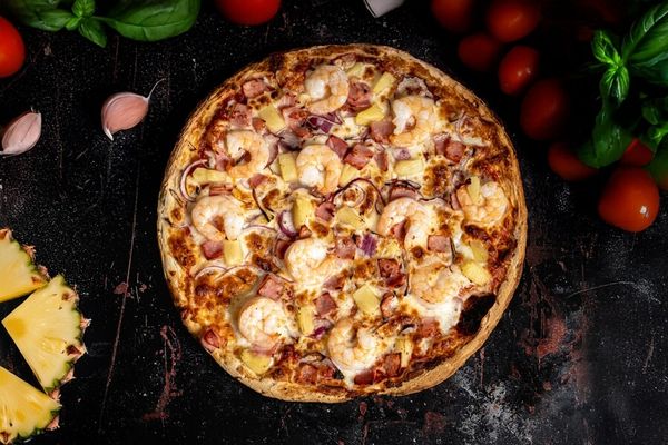 Pizza Sauce, Mozzarella, Bacon, Prawns, Onion & Pineapple